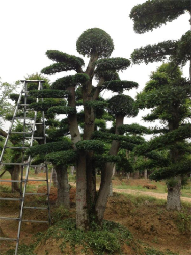 造型榆樹:選用深山老林采挖的形態(tài)各異的老榆樹移植至素沙土地,經(jīng)過數(shù)年的精心培育,枝葉茂盛之后方可造型。